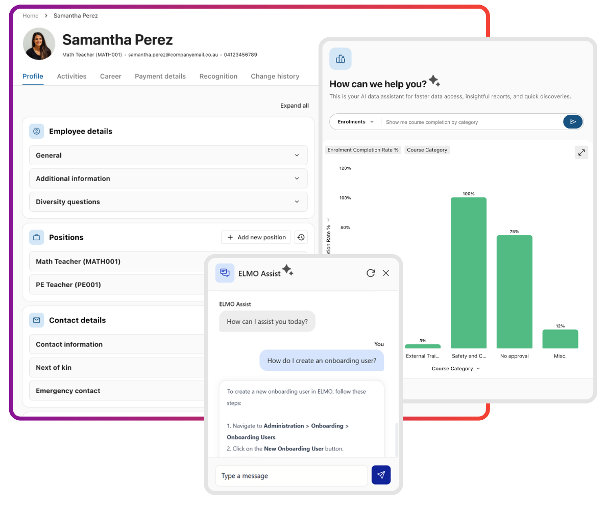Centralise employee data records – from hire-to-retire – and sync profile updates in HR Core. Layer ELMO’s AI-powered natural language insights engine over a complete data foundation to inform workforce decisions in real time, no spreadsheets or data analysts required.